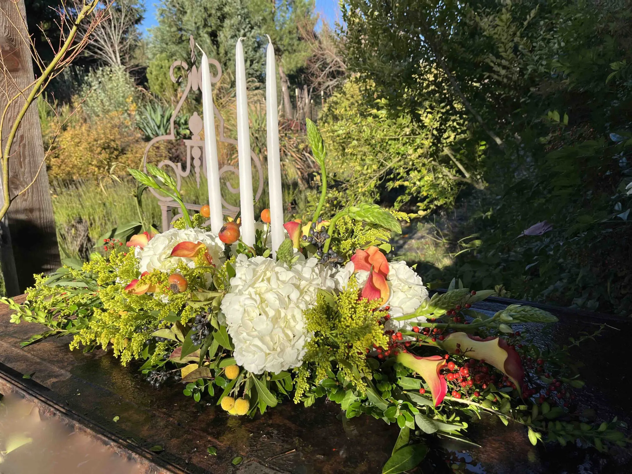 2025 Thanksgiving flower menu is a beautiful selection of lush white Hydrangea & gorgeous fall colored Calla Lily from our favorite farms, plus our own farm collection of heritage Chrysanthemums, arranged with Fall garden accents and Woodland Foraged Oak and Bay.